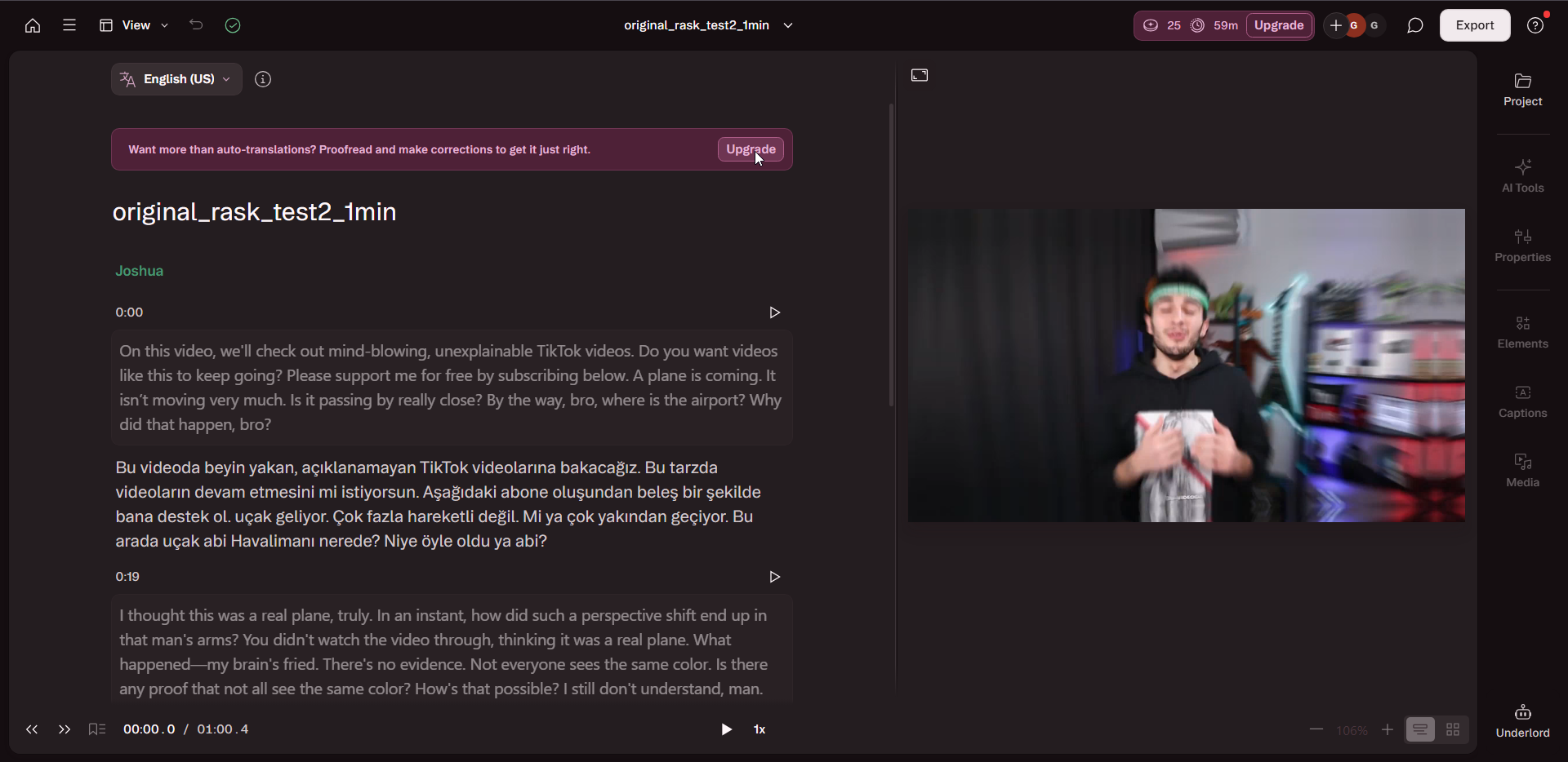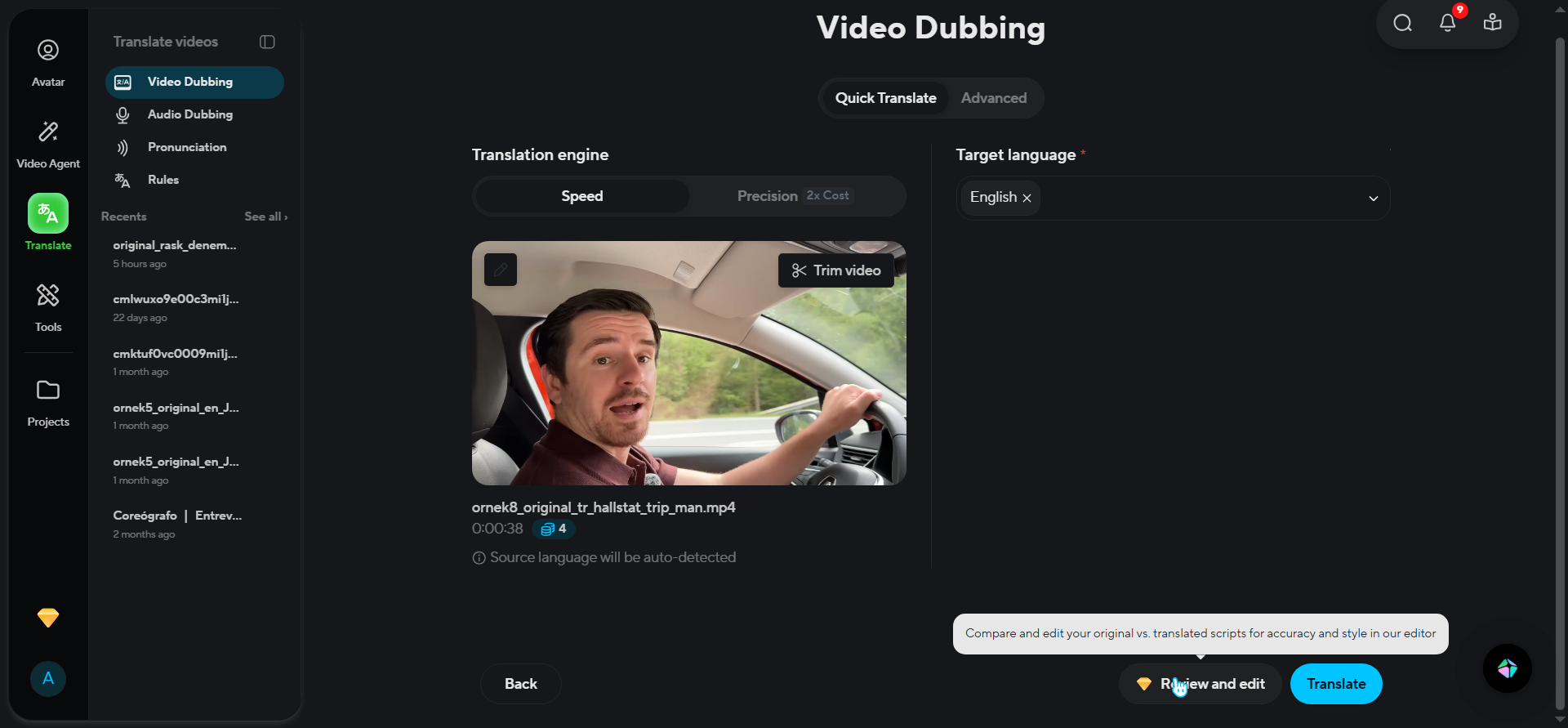 Upload a clip, run it through the dubbing pipeline, and edit the specific lines that need fixing — without touching the rest of the video. Free trial: 1 minute per video, no credit card required.