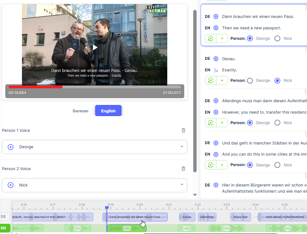 Eskiden bu anları düzeltmek için bir seslendirme sanatçısı tutmanız gerekebilirdi. GoodDub, cümle düzeyindeki editörüyle size çok daha hızlı bir hibrit iş akışı sunar: